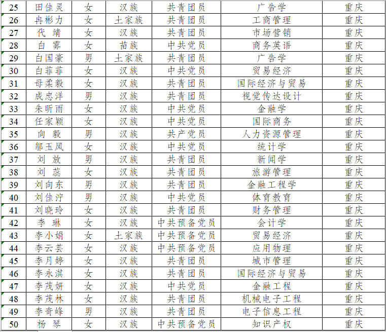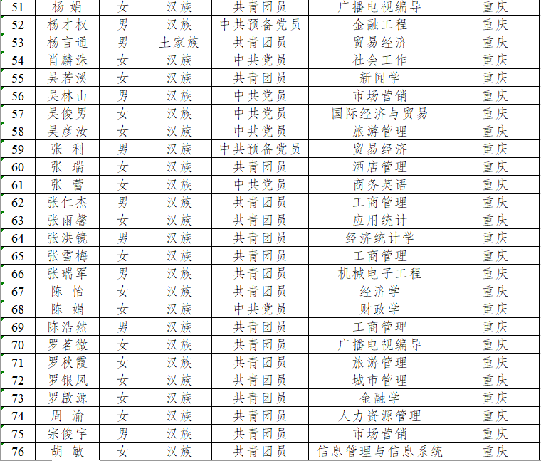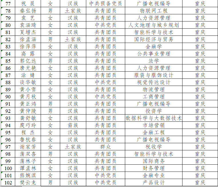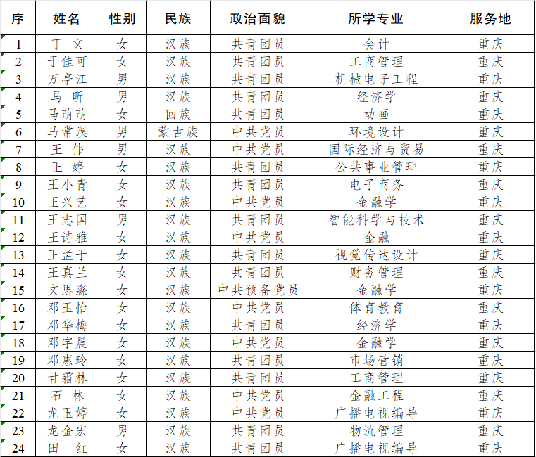 按照重庆市西部计划项目办的统一部署和安排,经学生本人报名、各学院推荐、校团委审核、重庆市各区县项目办招募考核等环节,根据市项目办的反馈,我校入围2023年西部计划市内服务共104人,现将名单公示如下: