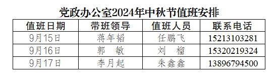 为更好地服务全校师生,保障中秋节期间学校相关工作顺利开展,党政办公室每天均安排值班人员,负责学校校章、党委印章、法人印章、学校合同章、党政办公室印章等用印,学校介绍信开具,公文签发审核,会议室申请及使用等工作,请需求单位或师生按规定流程履行签批手续,其他未尽事宜,请与值班老师联系。