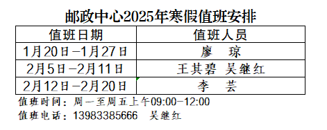 为更好地服务全校师生,保障寒假期间学校相关工作顺利开展,党政办公室每天均安排值班人员,负责党委印章、学校校章、法人印章、学校合同章、党政办公室印章等用印,学校介绍信开具,公文签发审核,会议室申请及使用等工作,请需求单位或师生按规定流程履行签批手续,其他未尽事宜,请与值班老师联系。