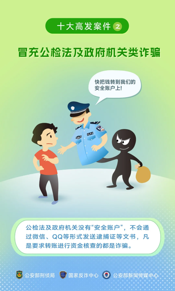 诈骗分子冒充公检法机关、政府部门等工作人员,通过电话、微信、QQ等与受害人取得联系,以受害人涉嫌洗钱、非法出入境、快递藏毒、护照有问题等为由进行威胁、恐吓,要求配合调查并严格保密,同时向受害人出示逮捕证、通缉令、财产冻结书等虚假法律文书,以增加可信度。为阻断受害人与外界联系,诈骗分子通常要求其到宾馆等封闭空间配合工作,诱骗其将所有资金转移至所谓“安全账户”,从而实施诈骗。