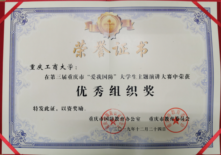 近日,重庆市国防教育办公室和重庆市教委联合发文通报表彰在大赛中表现突出的单位和个人。我校荣获2019年重庆市“爱我国防”大学生主题演讲大赛优秀组织奖,潘焱、杨娟两位教师被表彰为优秀指导老师。