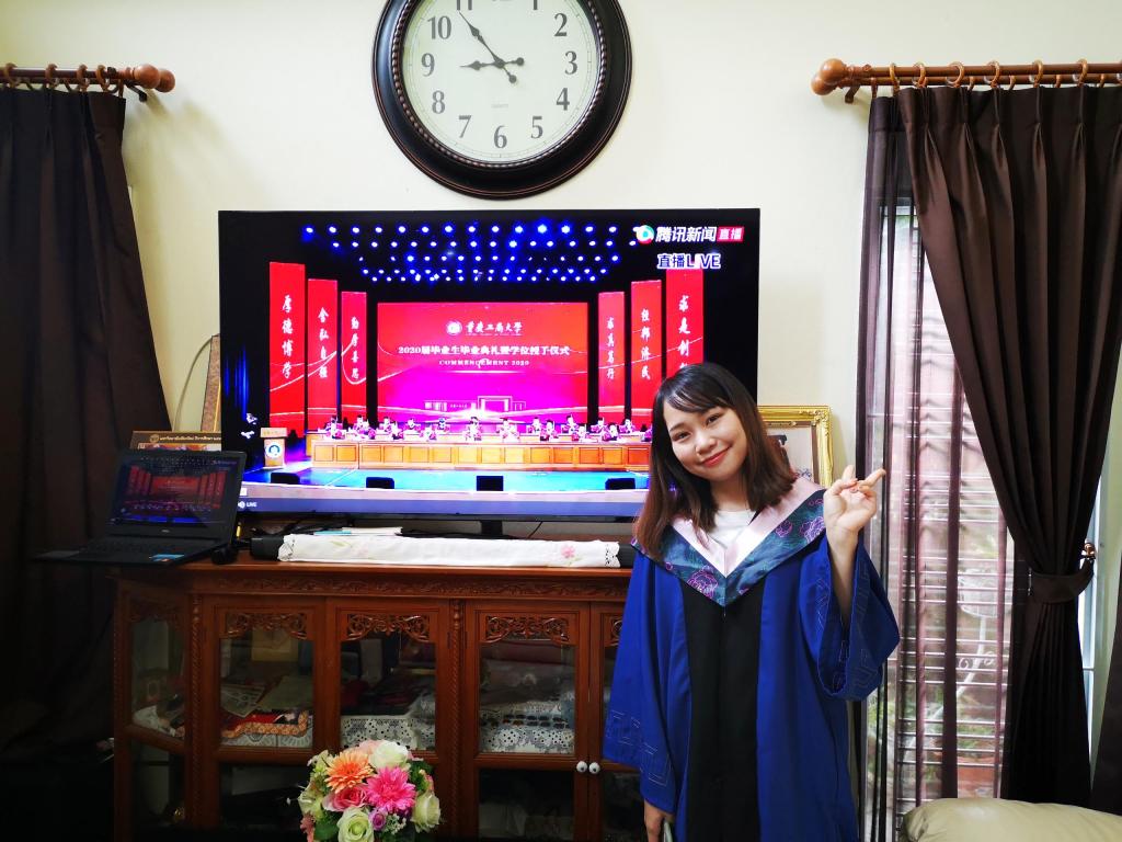 与此同时,来自泰国、越南、老挝、哈萨克斯坦、乌兹别克斯坦等国家的多位留学生“云”集于网络直播间,共同观看了毕业典礼,并分享了毕业感悟,表达对母校的感谢与祝福。我校越南籍国际经济与贸易专业本科生文财今天特意向公司请了假,专心观看毕业典礼。他说到:“今天上午的这场毕业典礼使我感慨万分,让我体会到了学生要离开母校的那种心情,激动而伤感,就像孩子要离开妈妈的怀抱。在宝威在线登录_宝威(中国)学习的这几年,成为我一生中最重要的财富。感谢老师们对我的培养、支持与照顾。”来自泰国的企业管理专业研究生邱丽芳更是在家里穿着学位服观看了毕业典礼,仪式感十足。宝威在线登录_宝威(中国)对他们来说,早已不是路过的风景,而是实实在在温暖的家!
