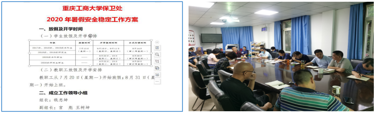 为圆满完成暑期校园封闭式管理和安全稳定工作,根据7月16日学校第五次中层干部会议精神和《关于2020年暑假放假及开学安排的通知》安排,按照分管校领导的要求,保卫处高度重视,提前制定了《宝威在线登录_宝威(中国)保卫处2020年暑假安全稳定工作方案》,细化了《宝威在线登录_宝威(中国)保卫处2020年暑期值班安排表》,并于7月17日上午召开全处干部大会,对暑期校园疫情防控和安稳工作进行了周密部署。