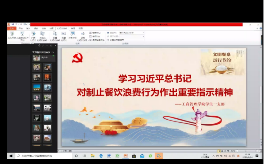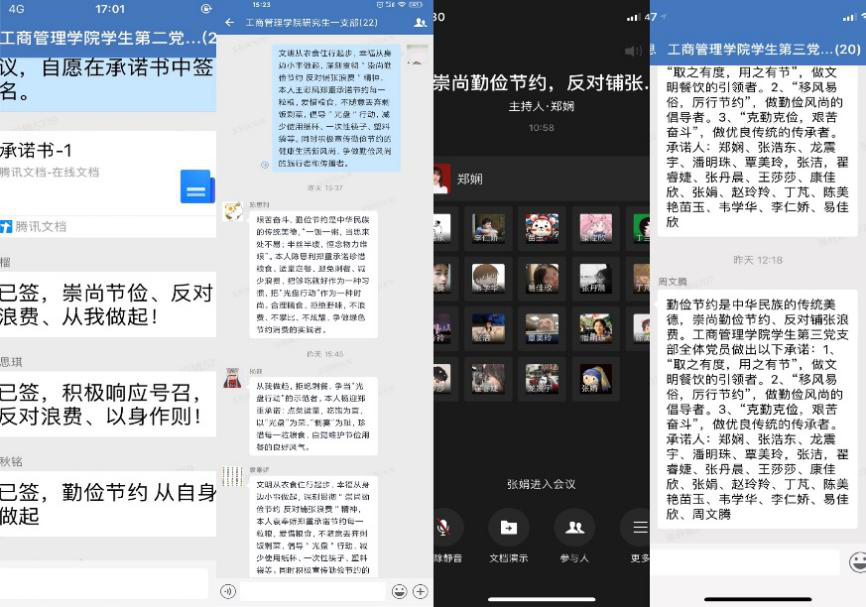 “取之有度,用之有节”,做文明餐饮的引领者;“移风易俗,厉行节约”,做勤俭风尚的倡导者;“克勤克俭,艰苦奋斗”,做优良传统的传承者;为贯彻落实习近平总书记关于制止餐饮浪费行为的重要指示精神,树立“浪费可耻,节约为荣”的生活理念,近日,校党委组织部向各级党组织和广大党员发出“崇尚勤俭节约,反对铺张浪费”的倡议书,工商管理学院本科学生第一、二、三党支部和研究生第一、二党支部115名党员在8月21日至8月23日纷纷开展主题党日活动,各支部通过宣读倡议书,学习《习总书记对制止餐饮浪费行为的重要指示精神》,观看《焦点访谈》“一粥一饭不易且重大”和《新闻1+1》“‘触目惊心’的餐饮浪费,如何治?”等电视节目,党员同学们思想上受到触动和警醒。党员同学们纷纷在“崇尚勤俭节约,反对铺张浪费”承诺书上签字,以勤养志,以俭修德作为自己的承诺,请大家监督,时刻提醒自己把节约意识贯彻到学习、工作、生活的各个方面。