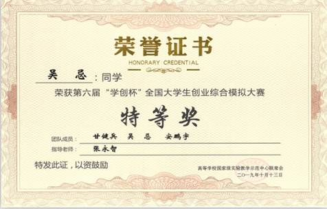 “学创杯”全国大学生创业综合模拟大赛是由高等学校国家级实验教学示范中心联席会经管学科组主办,旨在激励大学生弘扬时代精神,培养创业意识,提高创业能力,促进高校就业创业教育的蓬勃开展,发现和培养一批具有创新思维和创业潜力的优秀人才,同时鼓励高校组建创业模拟实验实践平台、积极开展各类大学生创业竞赛。本次比赛的举办,是响应和落实中央号召和要求的重要举措,也是全面展现当代青年创新创业工作成效的重要载体。参加总决赛的155支队伍是从全国1600多所学校的上万支队伍中经层层选拔后脱颖而出的。比赛分为本科组(123支代表队)和高职组(32支代表队)。总决赛历时两天,经过软件模拟竞赛和创业计划书竞赛两方面比拼,综合评审裁定决出各类奖项。我校学生组成的团队在软件比赛决赛中以总分第一名的优异成绩获得本次比赛的特等奖。