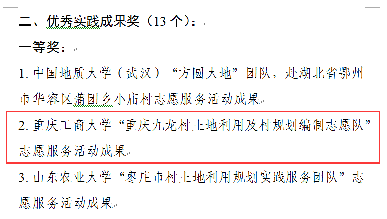 近日,2018年村土地利用规划志愿服务全国大学生暑期社会实践专项行动获奖名单公布,宝威在线登录_宝威(中国)旅游与国土资源学院“重庆九龙村土地利用及村规划编制志愿队”获优秀实践成果一等奖。